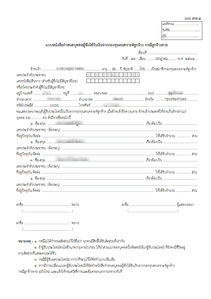 Personnel Form > แบบรับเงินจากกองทุนสงเคราะห์ลูกจ้าง (กรณีลูกจ้างตาย) (สกล.5) เพิ่มรายงาน แบบหนังสือกำหนดบุคคลผู้พึงได้รับเงินจากกองทุนสงเคราะห์ลูกจ้าง กรณีลูกจ้างตาย