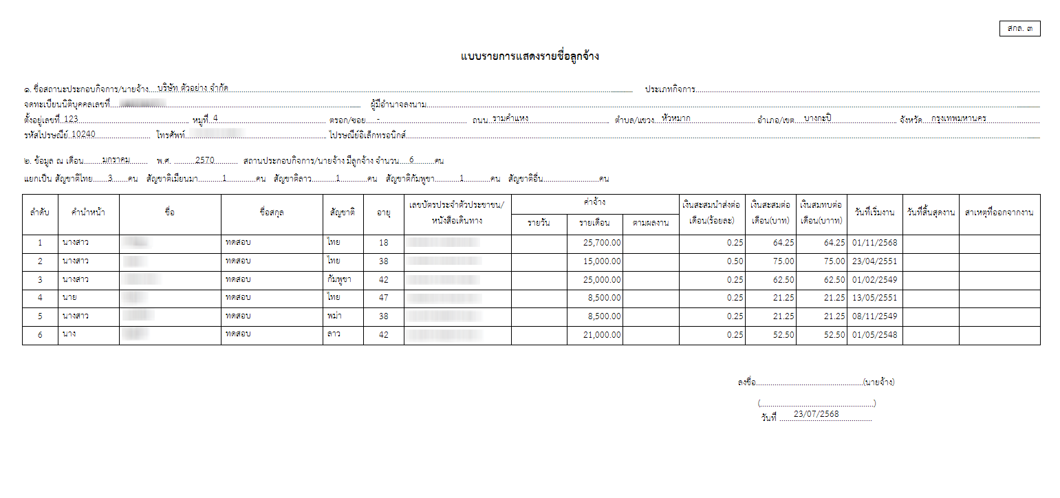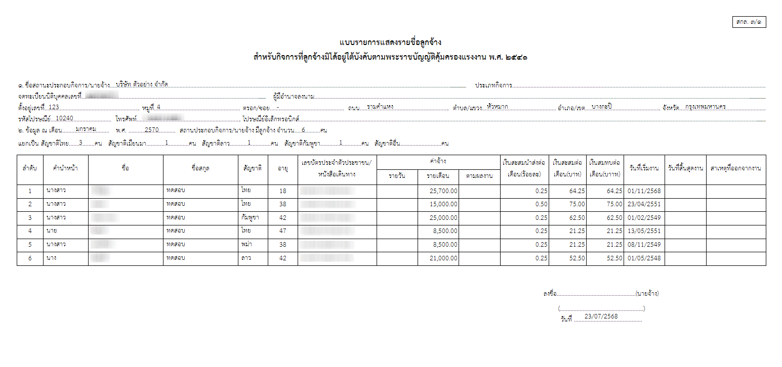 แบบรายการแสดงรายชื่อลูกจ้าง สำหรับกิจการที่ลูกจ้างมิได้อยู่ใต้บังคับตามพระราชบัญญัติคุ้มครองแรงงาน พ.ศ. ๒๕๔๑ เป็นการแสดงข้อมูลพนักงานที่มีประมวลผลหักนำส่งกองทุนสงเคราะห์ลูกจ้างแต่ละเดือน  โดยมีรายละเอียดดังนี้