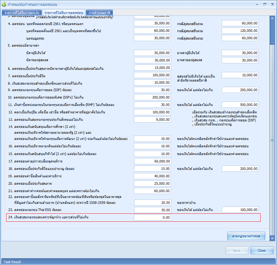 Setup > Payroll > กำหนดข้อกำหนดลดหย่อน > Tab รายการที่ได้รับการลดหย่อน เพิ่มข้อกำหนด “เงินสะสมกองทุนสงเคราะห์ลูกจ้าง เฉพาะส่วนที่ไม่เกิน” สำหรับกำหนดให้คำนวณหักค่าลดหย่อนภาษี กรณีพนักงานมีคำนวณสะสมกองทุนสงเคราะห์ลูกจ้าง เมื่อประมวลผลรายได้