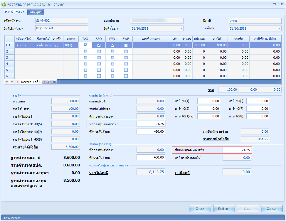 Payroll > ประมวลผลรายได้ > ตรวจสอบการคำนวณรายได้-รายหัก เพิ่มแสดงจำนวนเงินหักกองทุนสงเคราะห์ฯ นายจ้างและลูกจ้าง สามารถแก้ไขข้อมูลหักกองทุนสงเคราะห์ฯ ผ่านหน้าจอได้
