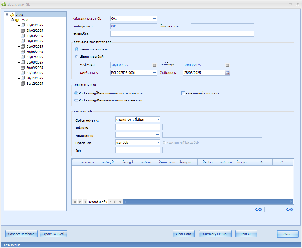 Payroll > ประมวลผล GL ปรับ Process การแสดงข้อมูลรองรับการประมวลผลรายการลงบัญชี กองทุนสงเคราะห์ลูกจ้าง สรุปตามรหัสบัญชี, ชื่อบัญชี, รหัสหน่วยงาน, ชื่อหน่วยงาน, ชื่อกลุ่มพนักงาน, ชื่อ Job, รหัสระดับ และ ชื่อระดับ