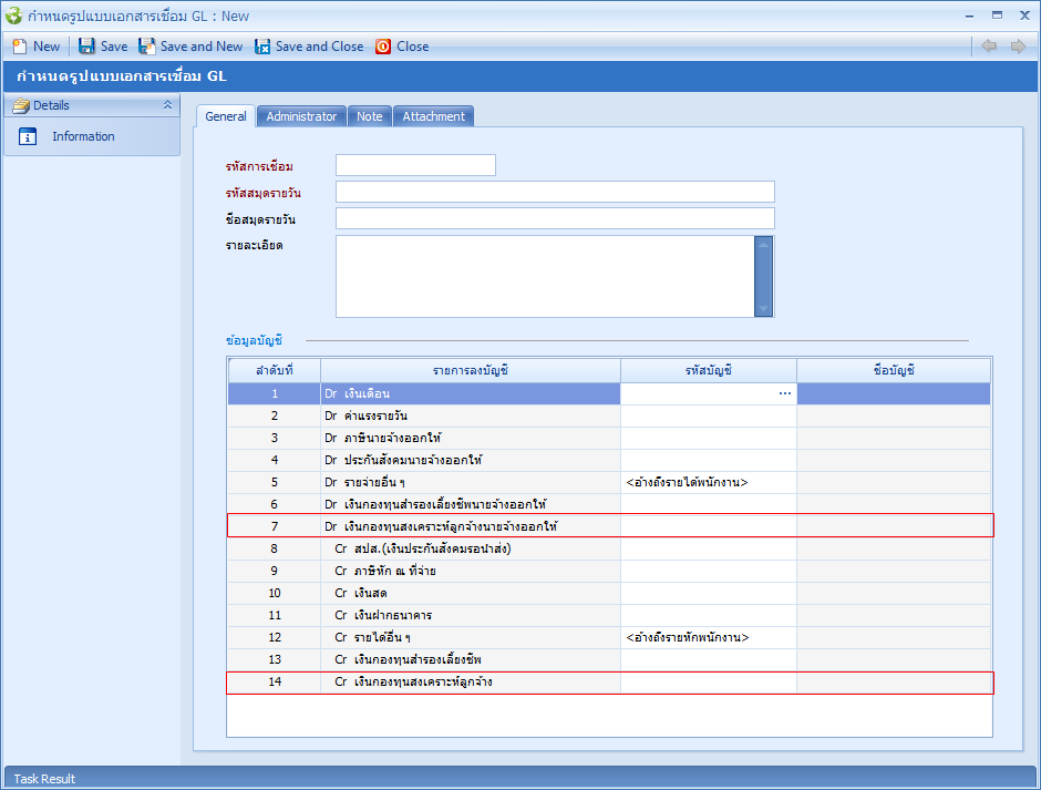 Setup > Payroll > กำหนดรูปแบบเอกสารเชื่อมต่อ GL เพิ่มรายการลงบัญชี “Dr. เงินกองทุนสงเคราะห์ลูกจ้างนายจ้างออกให้” และ “Cr. เงินกองทุนสงเคราะห์ลูกจ้าง” เพื่อกำหนดรหัสลงบัญชีสำหรับประมวลผล GL