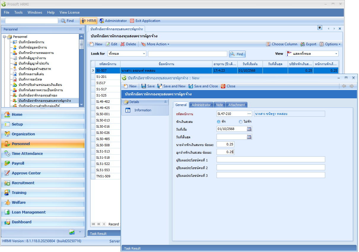 Personnel > บันทึกอัตราหักกองทุนสงเคราะห์ลูกจ้าง เพิ่มหน้าจอสำหรับกำหนดอัตราหักกองทุนสงเคราะห์ลูกจ้าง นายจ้างสมทบ และลูกจ้างสะสม ให้กับพนักงาน