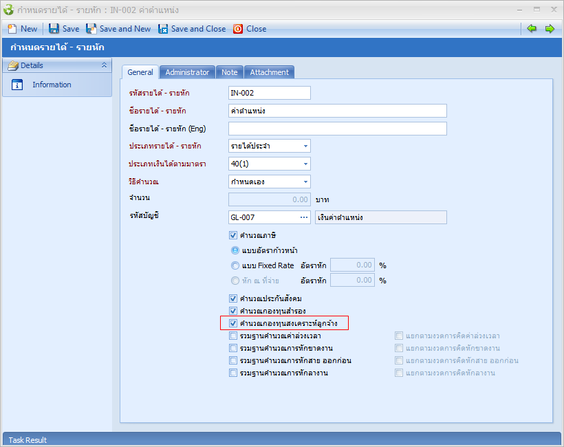 2. รายได้ประจำ, รายได้ไม่ประจำ, รายหักประจำ,รายได้ค่าล่วงเวลา และรายหักไม่ประจำ อ้างอิงข้อมูลรหัสรายได้-รายหักที่ประมวลผลรายได้ให้กับพนักงานในงวด และเลือกเงื่อนไข “คำนวณกองทุนสงเคราะห์ลูกจ้าง