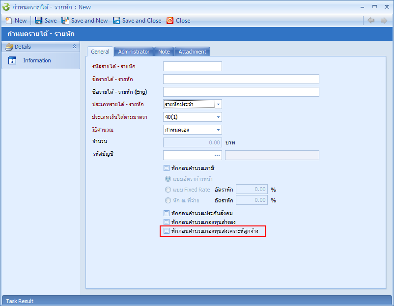 Setup > Payroll > กำหนดรายได้ - รายหัก เพิ่มเงื่อนไข “คำนวณกองทุนสงเคราะห์ลูกจ้าง” และ “หักก่อนคำนวณกองทุนสงเคราะห์ลูกจ้าง”