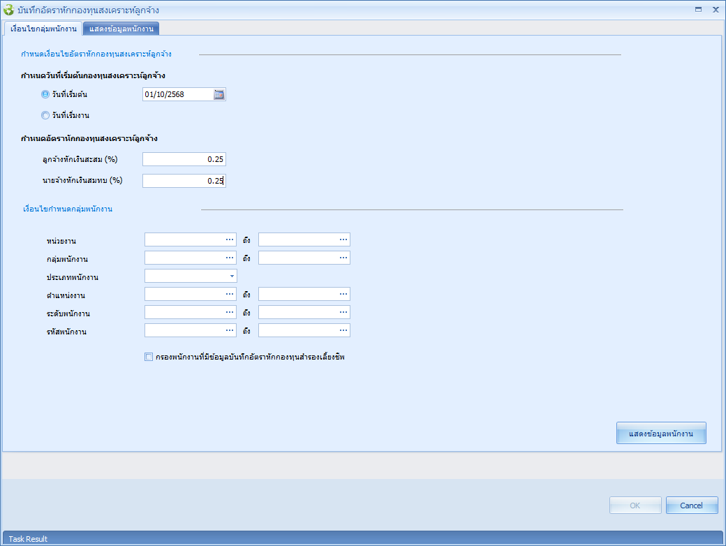 • กรองพนักงานที่มีข้อมูลบันทึกอัตราหักกองทุนสำรองเลี้ยงชีพ เลือกเพื่อกรองพนักงานที่มีบันทึกหักกองทุนสำรองเลี้ยงชีพ ออกจากช่วงข้อมูลที่ต้องการกำหนดอัตราหักกองทุนสงเคราะห์ลูกจ้าง