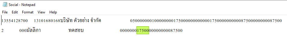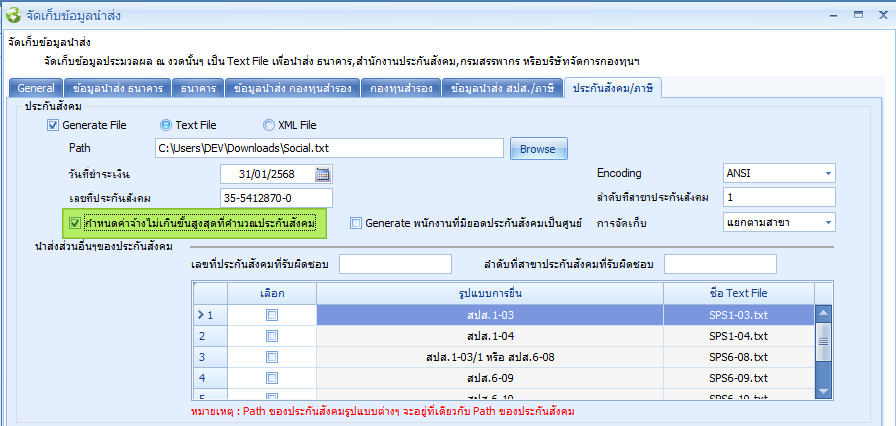 ตัวอย่าง การ Generate Text File เมื่อเลือก กำหนดค่าจ้างไม่เกินขั้นสูงสุดที่คำนวณประกันสังคม