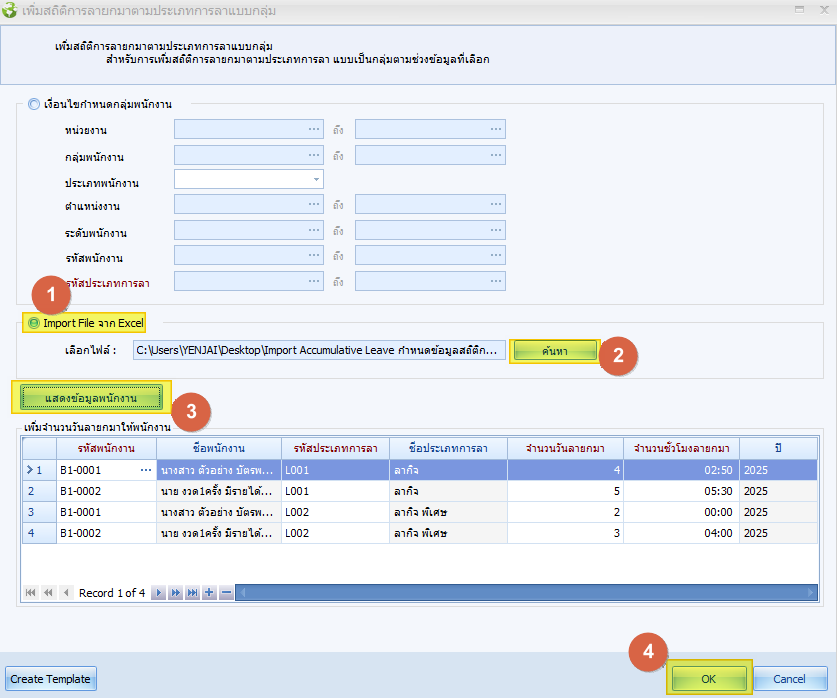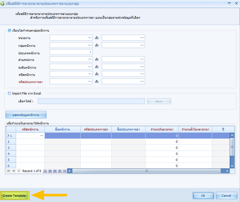 • เพิ่มสถิติการลายกมาตามประเภทการลาแบบกลุ่ม > Create Template เพื่อสร้างไฟล์สำหรับใช้ Import