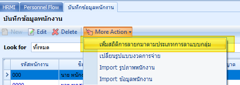 • Personnel > บันทึกข้อมูลพนักงาน : More Action > เพิ่มสถิติการลายกมาตามประเภทการลาแบบกลุ่ม