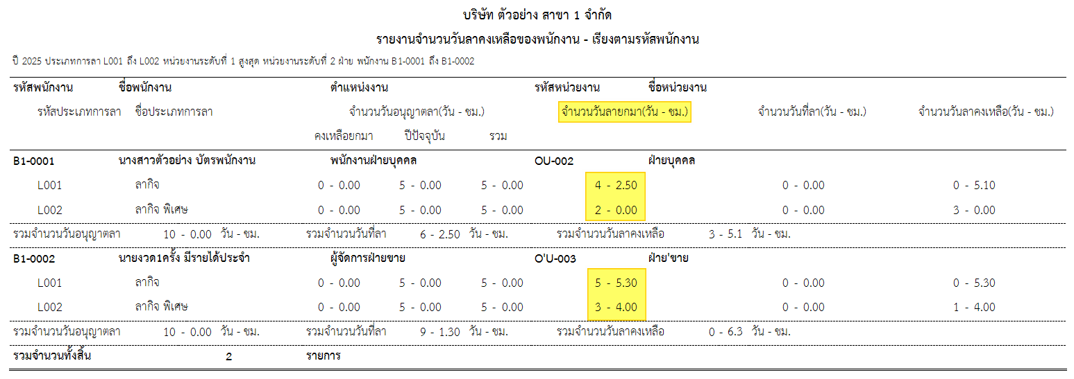 • Time Attendance > รายงานจำนวนวันลาคงเหลือของพนักงาน > เรียกดูรายงาน เพื่อดูว่าจำนวนวันลาที่ใช้ไปของพนักงาน ตรงกับที่ Import File จาก Excel