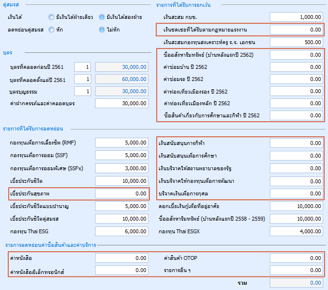 ในกรณีที่ประมวลผลสิ้นปีโดยไม่ได้เลือก ยกเว้นการลบข้อมูลลดหย่อนภาษี และเงินยกเว้นหลังประมวลผลสิ้นปีในส่วนของค่าลดหย่อนจะถูกเปลี่ยนเป็น 0.00 โดยมีรายการลดหย่อนดังต่อไปนี้