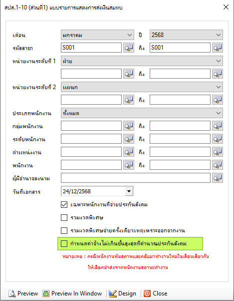 ตัวอย่าง เมื่อเลือก “กำหนดค่าจ้างไม่เกินขั้นสูงสุดที่คำนวณประกันสังคม