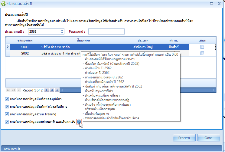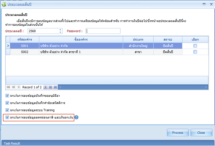 ในส่วนของตัวเลือกในการประมวลผลสามารถเลือก ยกเว้นการลบข้อมูลลดหย่อนภาษี และเงินยกเว้น เพื่อที่จะยกเว้น การลบข้อมูลลดหย่อนภาษี และเงินยกเว้นของพนักงานในองค์กรที่จะประมวลผลปิดสิ้นปี