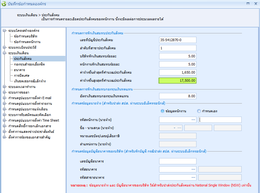 • Organization > บันทึกข้อกำหนดองค์กร > ระบบเงินเดือน > ประกันสังคม