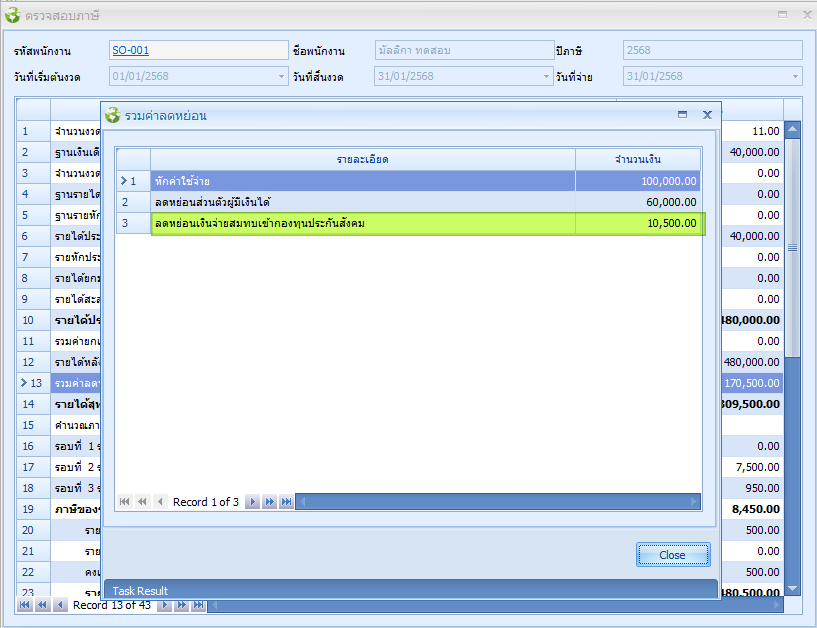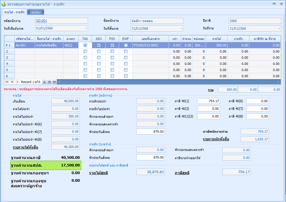 • Payroll > ประมวลผลรายได้ > ตรวจสอบภาษี > รวมค่าลดหย่อน
