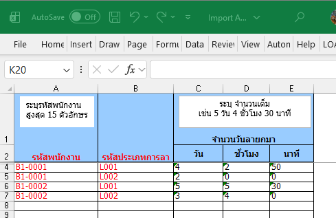 สามารถกำหนดข้อมูลสถิติการลายกมาแบบกลุ่มของพนักงานได้ด้วยการ Import ข้อมูลผ่านไฟล์ Excel โดยกำหนดได้ตามขั้นตอนดังนี้