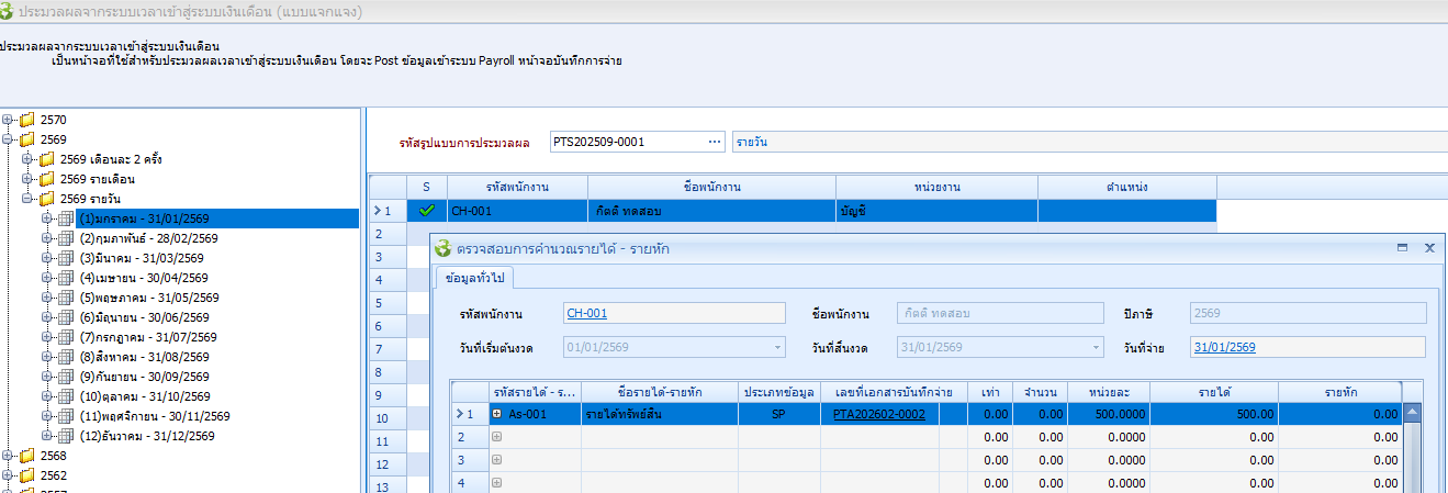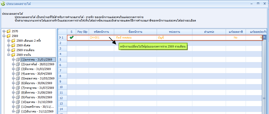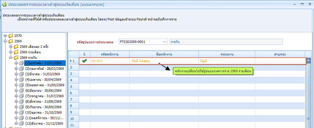 แต่จะไม่สามารถทำการประมวลผล หรือทำการลบประมวลได้ ต้องทำการย้ายรูปแบบงวดการจ่ายมาให้ตรงกับงวดที่ต้องการประมวลผล หรือลบการประมวลผลข้อมูล